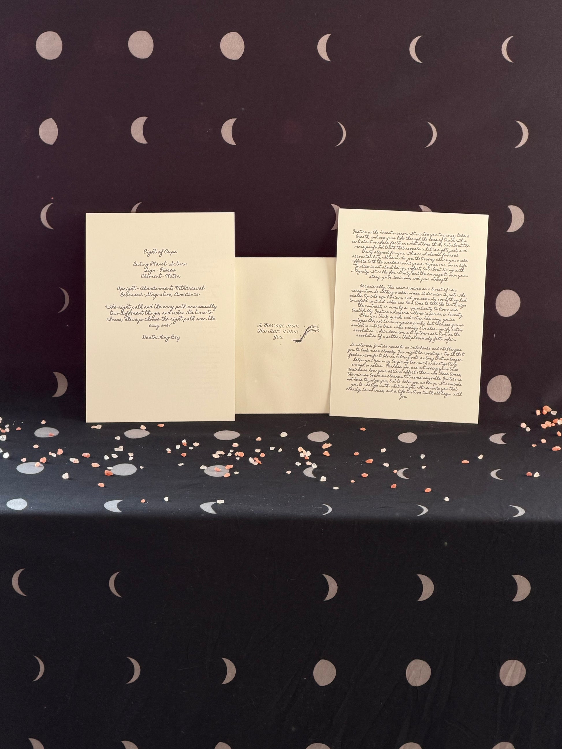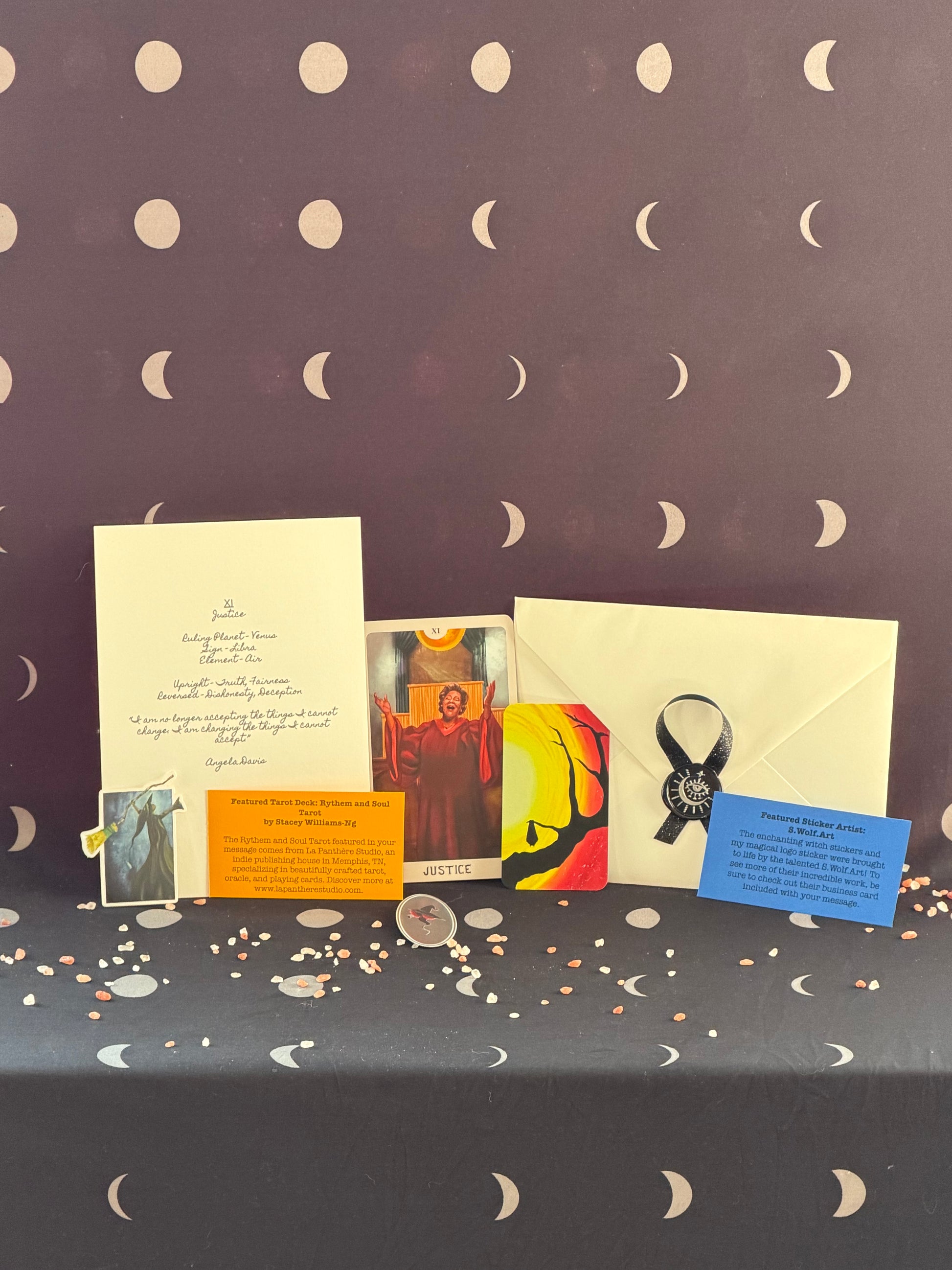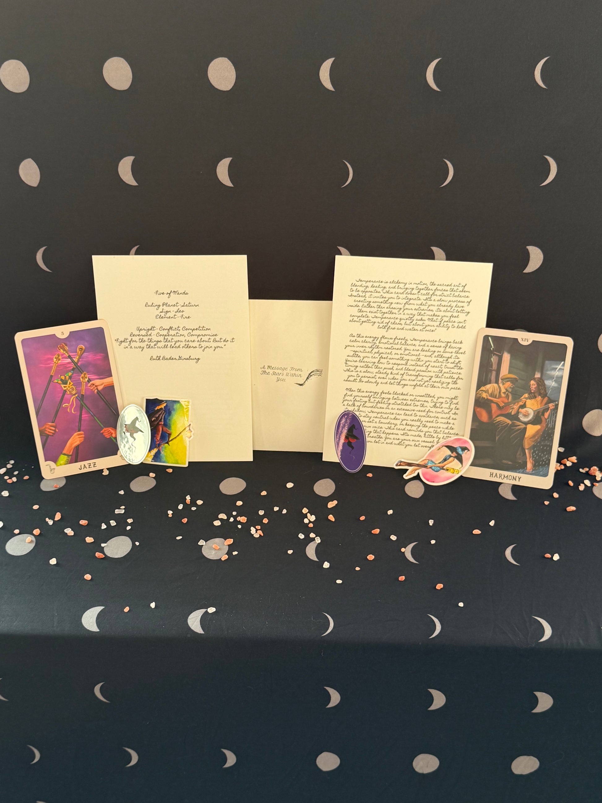 A message, a symbol, a spark of meaning — each envelope holds a tarot card and its story. Inside, you’ll find a handwritten-style tarot message, a featured indie tarot artist’s card, a sticker with a featured indie sticker artist, and a touch of branded magic — art, intuition, and inspiration, sealed just for you. Each message highlights different artists, so every envelope is a unique blend of creative energy and insight.