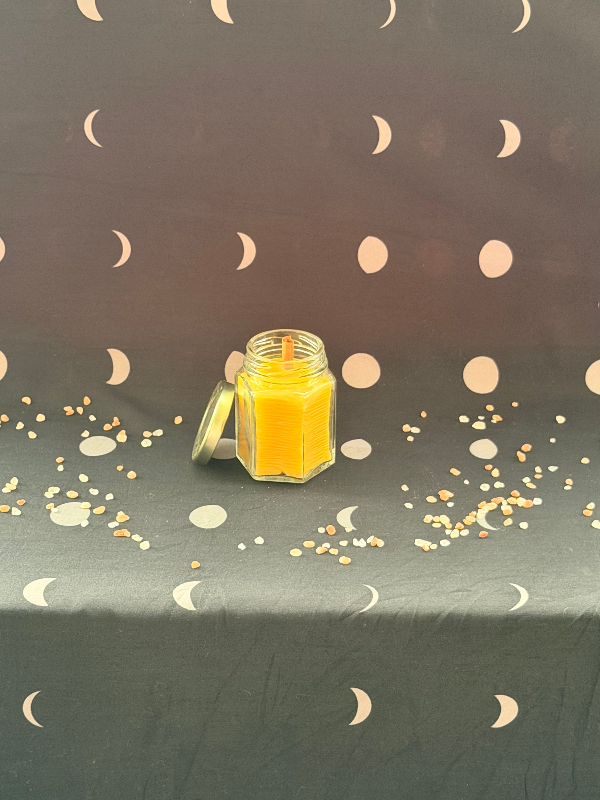 This petite hexagonal jar has taken on new life as a beeswax candle, crafted from ethically sourced wax with a naturally sweet aroma. Its geometric form evokes the artistry of real honeycombs, glowing with a soft, magical warmth that feels both earthy and enchanting.
