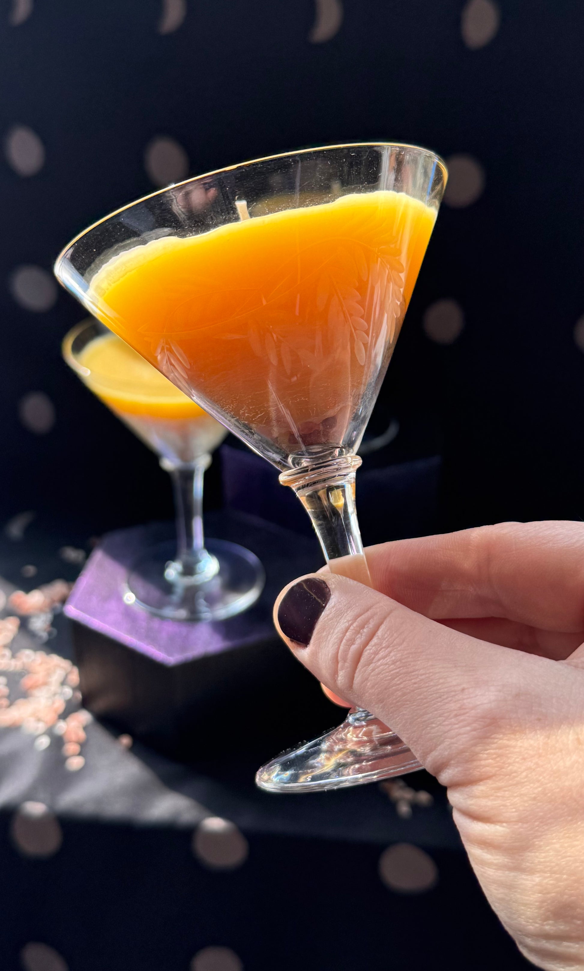 This spellbinding trio of midcentury martini glasses has been reborn into luminous vessels of intention and light. Each glass, adorned with delicate etched florals, holds hand-poured, locally sourced beeswax that glows like captured sunlight. The gentle flicker of the flame and the whisper of wood wicks invite quiet moments, dreamy rituals, and a touch of old-world enchantment to your space.