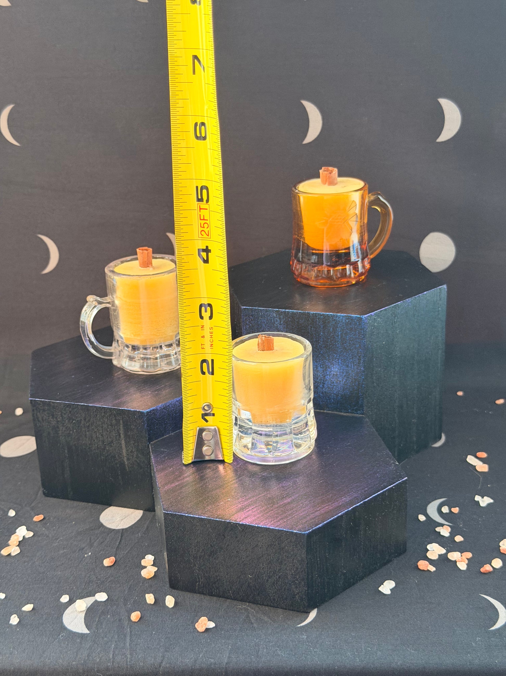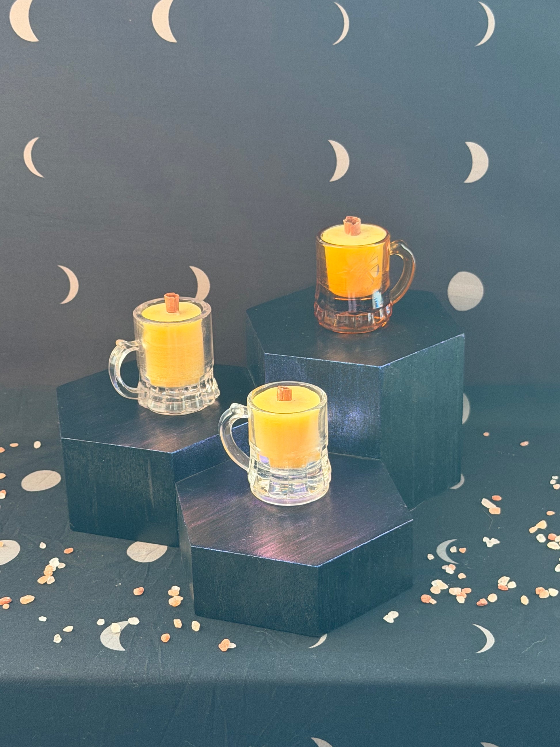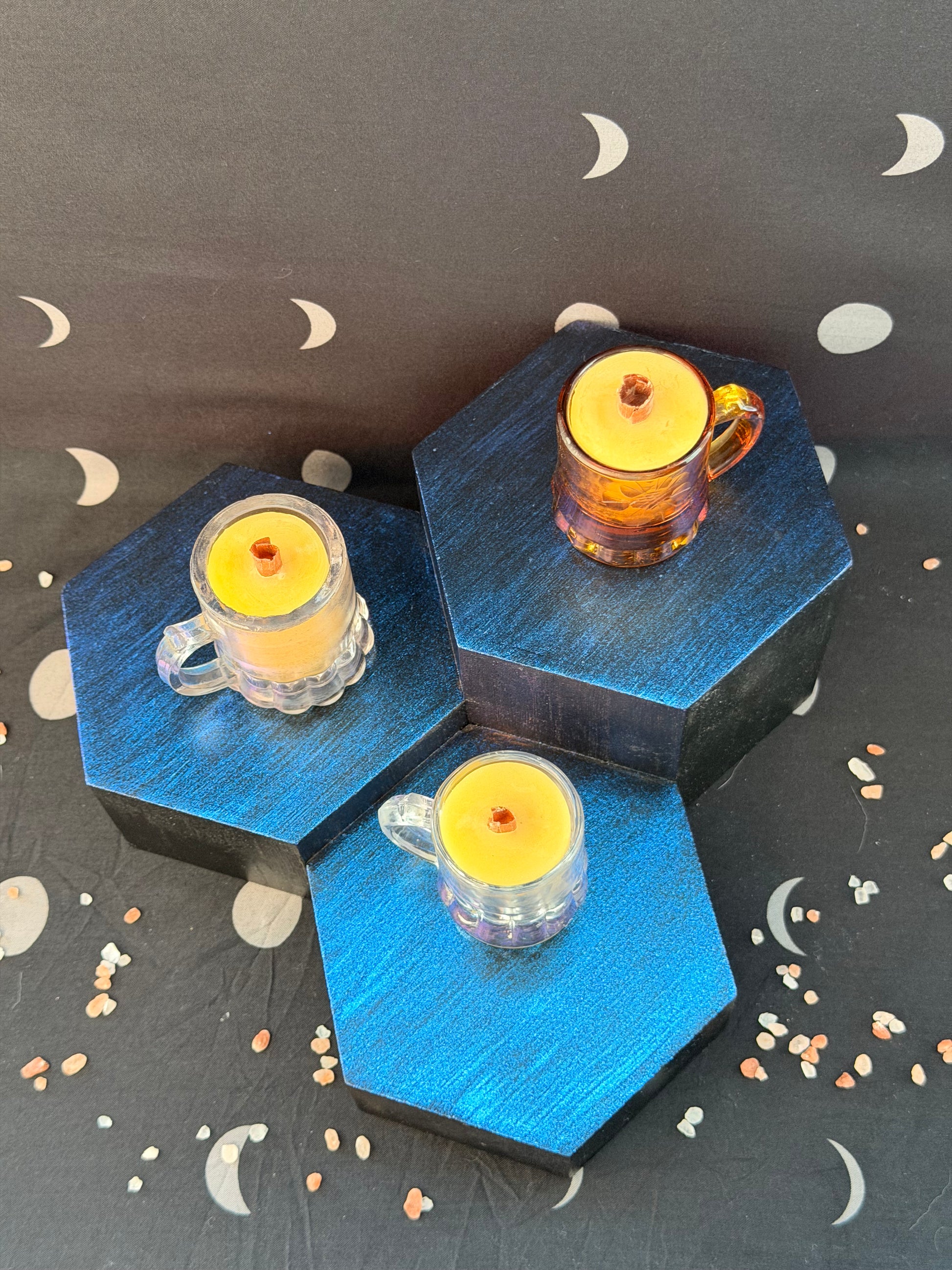 Forged in glass and filled with pure, locally gathered beeswax, this trio of mini mug candles glows with the warmth of ancient hearth magic. Light them to summon a soft golden radiance — a flicker of enchantment, a whisper of old-world charm, and a spark of wonder woven into every flame.